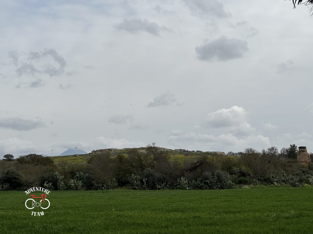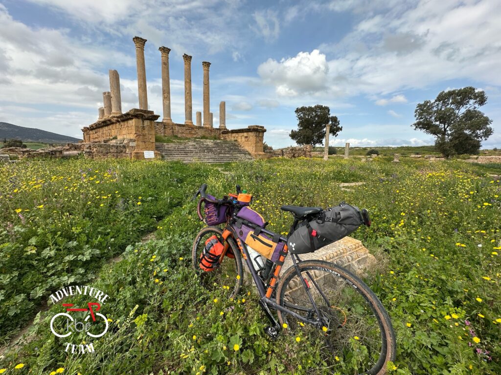 Ten sposób pokonywania trasy (dość szybko znikał nam dystans do celu) zwłaszcza tego dnia okazuje się mieć pozytywne skutki. Fakt, wyjechaliśmy wcześniej z noclegu, bo w planach było dotrzeć na miejsce do godziny 15. Bowiem właścicielka, przemiła Manel, prosiła, byśmy zjawili się na noclegu, a w szczególności zamówionym obiedzie do tej właśnie godziny, gdyż potem ona (a jak się przekonamy na miejscu: one) mogła pojechać do Tunisu na ramadanową kolację z rodziną. Ale dzięki ucieczkom Damiana przed lokalną fauną nagle okazało się, że prawie przy El-Fahns jesteśmy dobre 3h wcześniej, niż trzeba. Rzut oka na mapę… i okazało się, że ruiny rzymskiego miasta wręcz czekają na nas przy trasie. Nawet nie trzeba daleko zjeżdżać ze śladu.